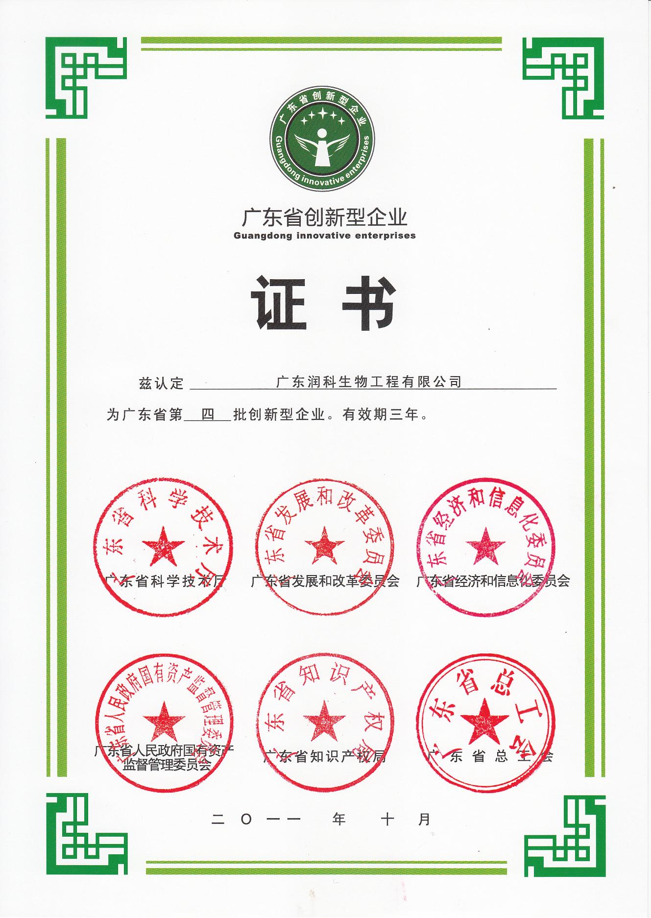 2011年10月,第四批广东省创新型企业名单出炉,广东润科生物工程有限公司榜中有名,顺利通过广东省科技厅、省发改委、省经信委、省国资委、省知识产权局和省总工会六部门考核,跻身广东省创新型企业的行列。