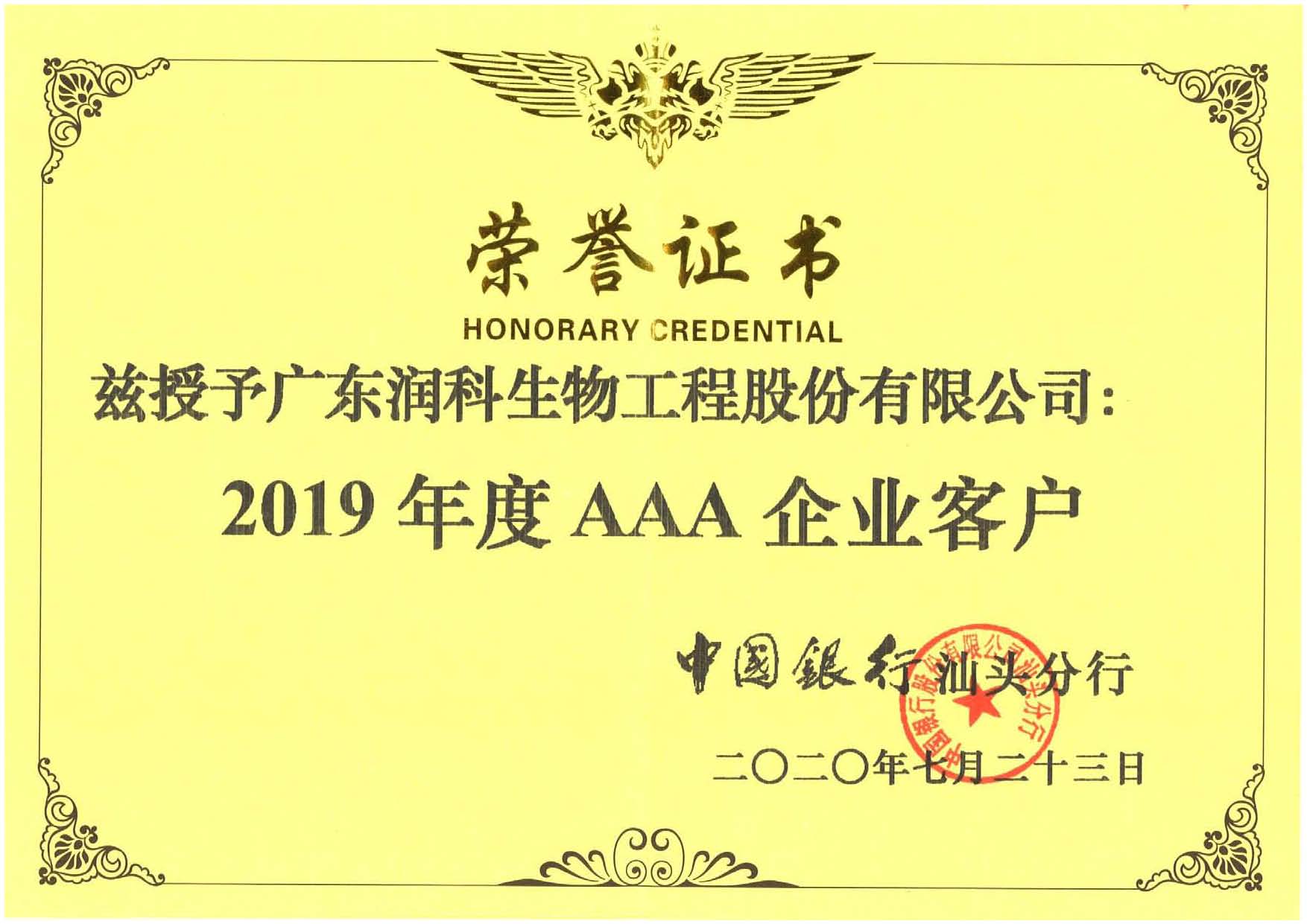 公司荣获中国银行授予2019年度AAA企业客户证书