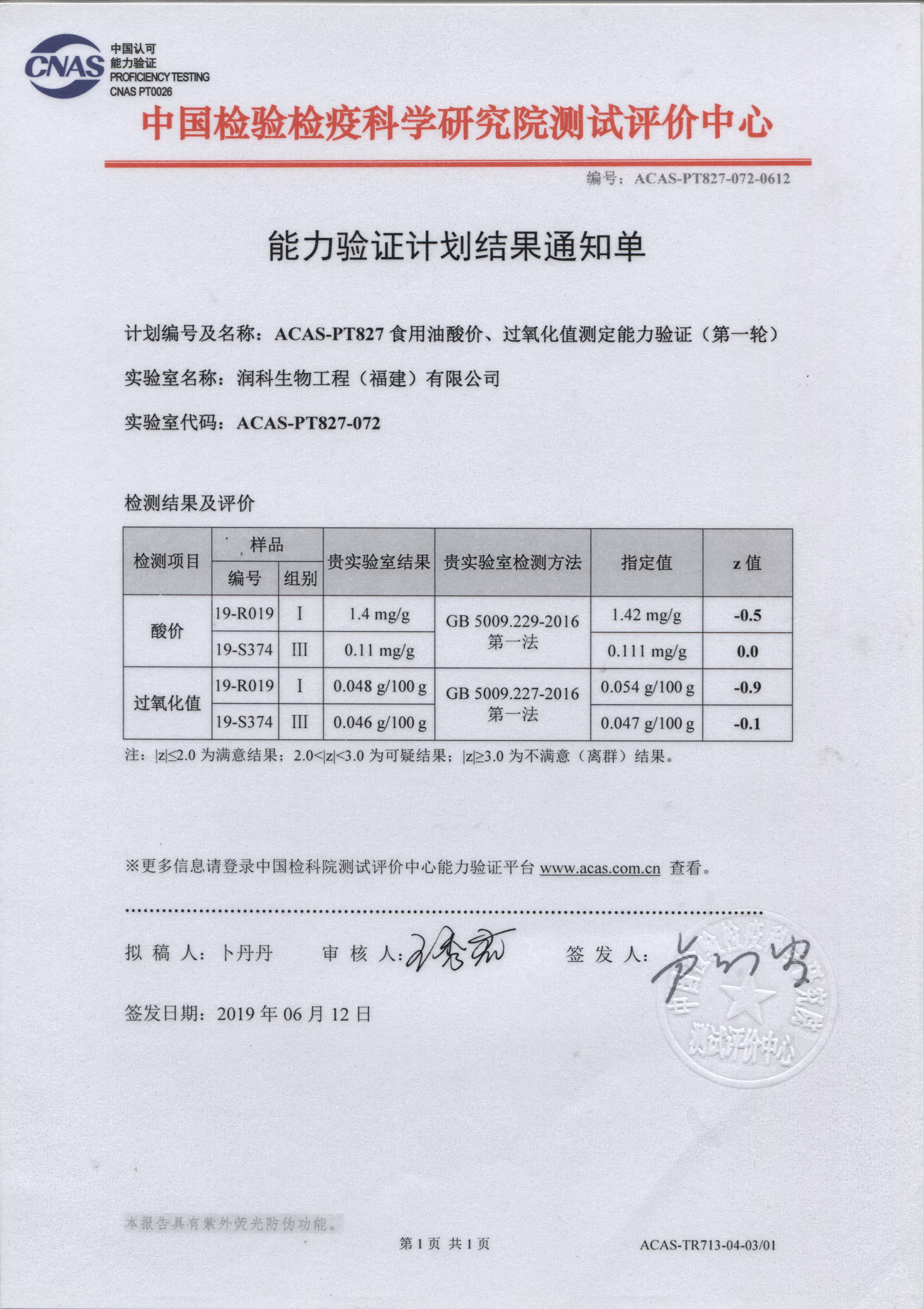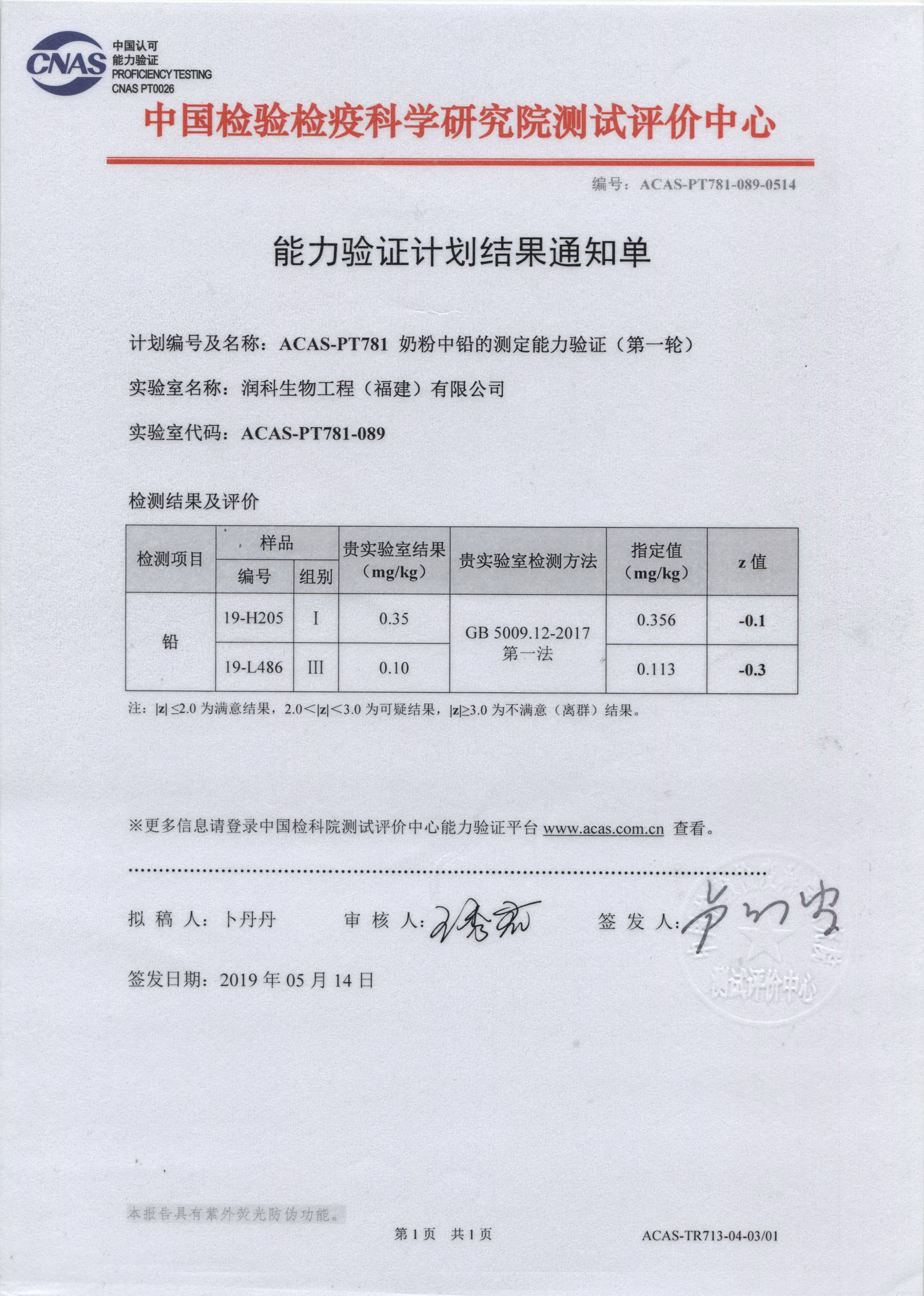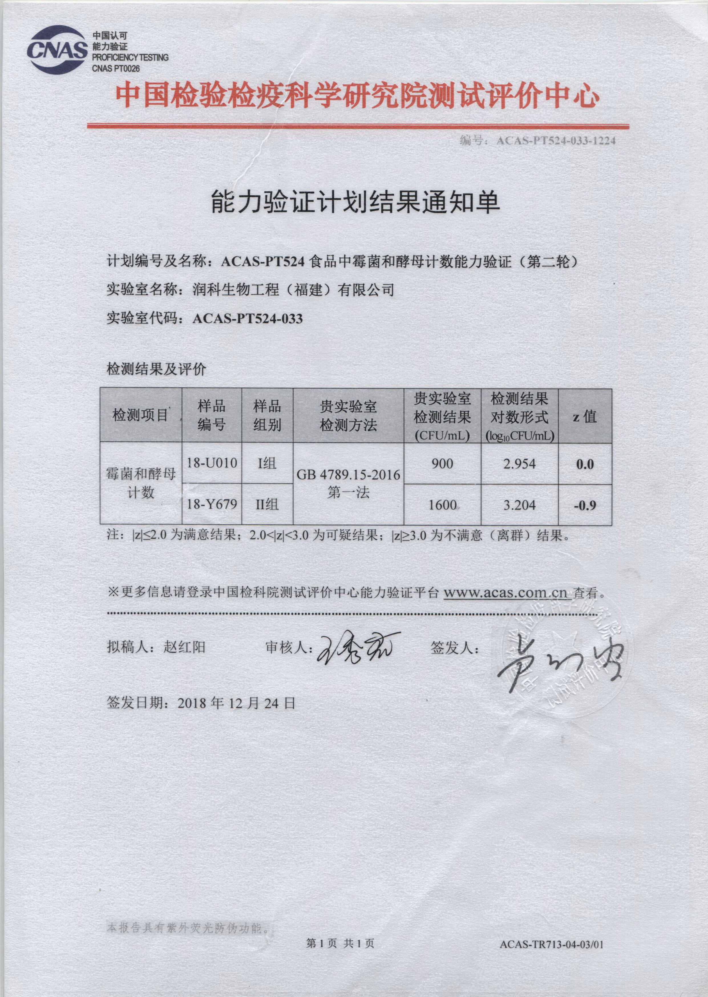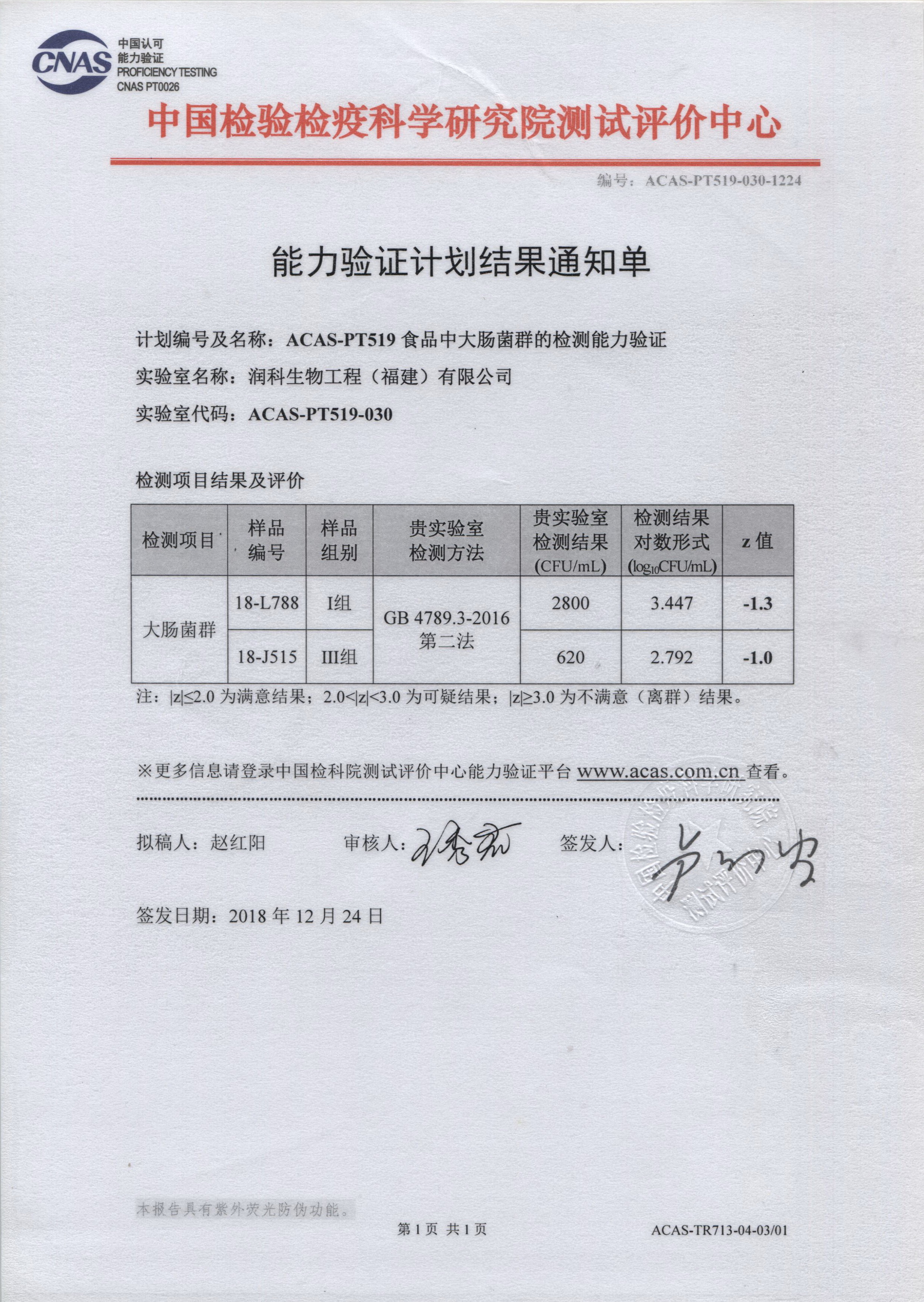 润科生物中心实验室积极参加中国检验检疫科学研究院测试评价中心开展的能力验证计划,累计已参与了邻苯二甲酸二丁酯、硝酸盐、菌落总数、大肠菌群、阪崎肠杆菌、霉菌和酵母计数、铅、酸价、过氧化值等15项指标检测能力验证,验证评价结果均为满意。