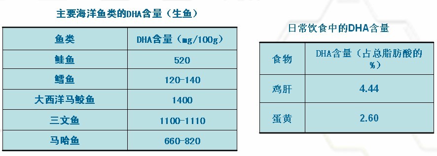 在日常膳食中,DHA主要存在于深海鱼类等海产品中。另外,在动物肝脏和蛋黄中也有少量DHA。