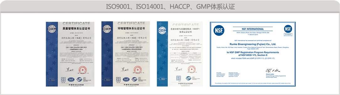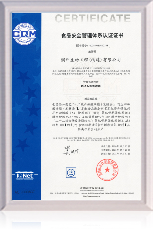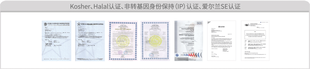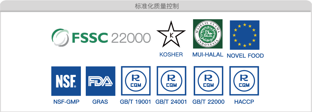 通过多项产品和管理体系认证,如:FSSC22000、ISO9001、ISO22000、ISO14001、HACCP、IP非转基因、KOSHER犹太及HALAL 清真认证,欧盟新资源食品实质等同认证、美国FDA-GRAS认证、GMP认证等,全方位构建起产品安全品控体系。